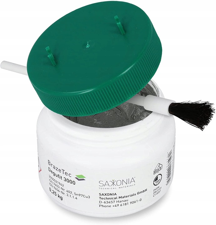 Pasta pro měkké pájení měděných trubek s měděnými, mosaznými a bronzovými tvarovkami, pro instalaci studené a teplé vody, instalaci topení do 110 °C dle DIN EN 29 453 a tavící přísady 3.1.1 C, DIN 29 454 -1. Složení: 97% Sn, 3% Cu. S-Sn97Cu3. Rozpustná ve studené vodě, zbytky lze snadno odstranit oplachem. Nedochází k přehřátí trubky a fitinky protože správnou teplotu pájení lze rozpoznat, po dosažení optimální teploty šedá pasta změní barvu na stříbrnou. Plastová dóza se štětcem obsahuje 250 g pasty.