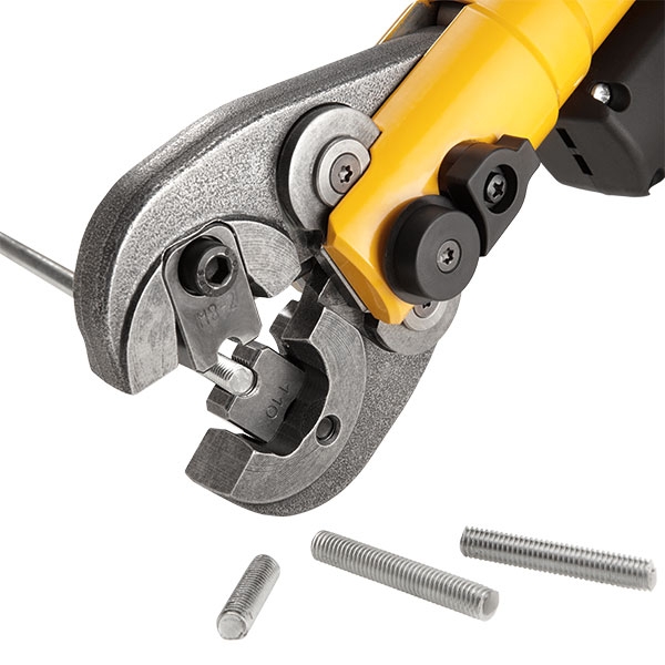 Vysoce zatížitelné dělicí kleště M 12 z kované a zvlášt’ kalené speciální oceli pro dělení závitových tyčí M 12. Otočné dělicí vložky pro dvojnásobnou životnost. Pro - Ocel, nerezavějící ocel do třídy pevnosti 4.8 (400 N/mm2). Závitovou tyč leze po provedeném dělení bez dodatečné úpravy našroubovat do závitového připojení trubkové objímky nebo matice. Dělící zařízení je vytvořeno jako lisovací kleště (Patent EP 1 459 825, Patent US 7,284,330). Pohon prostřednictvím všechradiálních lisů REMS (mimo REMS Mini-Press ACC) a vhodnými radiálními lisy jiných výrobců. Všechny dělící kleště označené * mají další připojení (Patent EP 1 223 008, Patent US 6,739,172) pro manuální pohon prostřednictvím ručního radiálního lisu REMS Eco-Press.