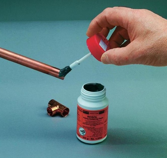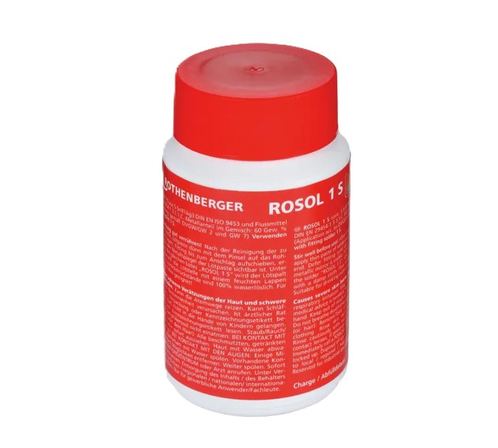 Profesionální pájecí pasta Rothenberger Rosol 1S se stříbrem S-Sn97Ag3, pro měkké pájení měděných trubek s měděnými fitinky a mosaznými tvarovkami pro instalaci studené a teplé vody. Kvalitní pájecí pasta dle DIN EN ISO 9453 a DIN EN 29454-1, 3.1.1.C, se zkušební značkou DVGW Reg.Nr. DV 0101AT2247, dle DIN EN 29543. Balení 250g s integrovaným štětcem. Návod k použití: Dobře rozmíchat! Vnější konec trubky a vnitřek fitinku očistit pomocí rouna např. Felder Rovlies. Pastu nanést štětcem na čistý konec trubky, ale ne do fitinku! Nahřát měkkým plamenem až ROSOL zateče, potom přiložit fitinkovou pájku se stříbrem S-Sn97Ag3. Po ochlazení letované místo očistit vlhkým hadříkem. Zbytky tavidla jsou 100% rozpustné ve vodě.