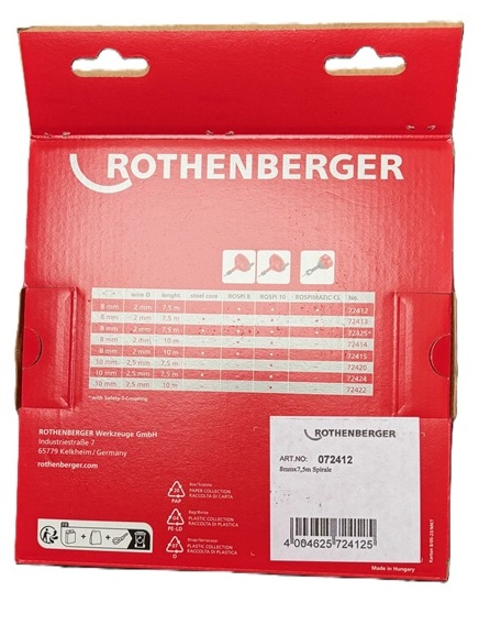 Originální Rothenberger spirála 8 mm x 7.5 m (Ø x d), tloušťka drátu 2mm, pro ROSPI 8, ROSPI 10. Příslušenství pro ROSPIMATIC, REMS Mini Cobra a další čističky odpadů. Vhodná pro průměry odpadů od 20 do 50 mm. Hmotnost 1,85 kg.