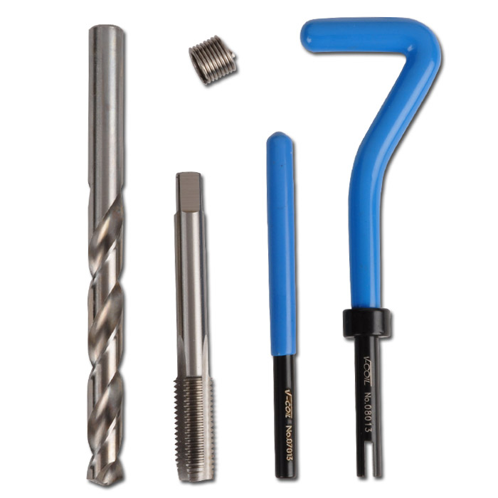 Slouží pro opravy poškozených nebo opotřebovaných závitů a opravy zmetků. Poškozený závit vyvrtejte běžným spirálovým vrtákem. V případě závitů na zapalovací svíčky není žádné předvrtání nutné, používá se kombinovaný vrtací a závitníkový nástroj. Pamatujte, že v případě tvářecích závitníků je nutné použít větší vyvrtaný otvor. Závitník a závitové čepy je nutné zkontrolovat ohledně stejného závitu a stoupání. Pomocí speciálního závitníku V-COIL-se do otvoru vyřeže uchytávací závit. Doporučujeme používat řezný olej. Montáž závitové vložky: Vložku nasaďte na nástroj a věnujte svoji pozornost tomu, aby čep unášeče lícoval s drážkovým otvorem a poté nastavte správně regulační kroužek. Poté pod mírným přítlakem zatočte závitovou vložkou ve směru závitu. Netočte proti směru otáček, čep by se mohl zlomit. Vyražení čepu: Po dokončení montáže vytáhněte zakrucovací nástroj a čep unášeče společně s vyražečem čepu. Při větších rozměrech a v případě závitu zapalovacích svíček je nutné čep vytáhnout pomocí špičatých kleští. Po dokončení těchto pracovních postupů díky přesným tolerancím, jakož i po vytvarování pružinového závitu vzniká závit, který bývá často lepší a silnější než původní závit. V-Coil závitové vložky jsou vyrobeny z vysoce kvalitní chromniklové nerezové oceli a vytváří pevné, vnitřní závity, které jsou odolné proti teplu a korozi. Jedinečná konstrukce zajišťuje vynikající závity, jejichž celkové vykonové charakteristiky nemohou být napodobeny žádným jiným způsobem. Použití: Pancéřování závitů materiálů s nízkou odolností proti obrušování, např. slitiny hliníku a hořčíku, ve strojírenství, v automobilovém průmyslu a servisních službách vozidel, v elektrotechnice a medicínské technice, jakož i v letectví a kosmonautice. Opravy poškozených nebo opotřebovaných závitů. Oprava zmetků. Obsah sady: 1 závitník M5 x 0,8; 1 spirálový vrták 5,2 mm; 1 manuální montážní nástroj s upevňovacím kroužkem č 8; 1 vyrážeč čepů č 8; 20 závitových vložek M5 x 0,8 Dodáváme v plastové kazetě.